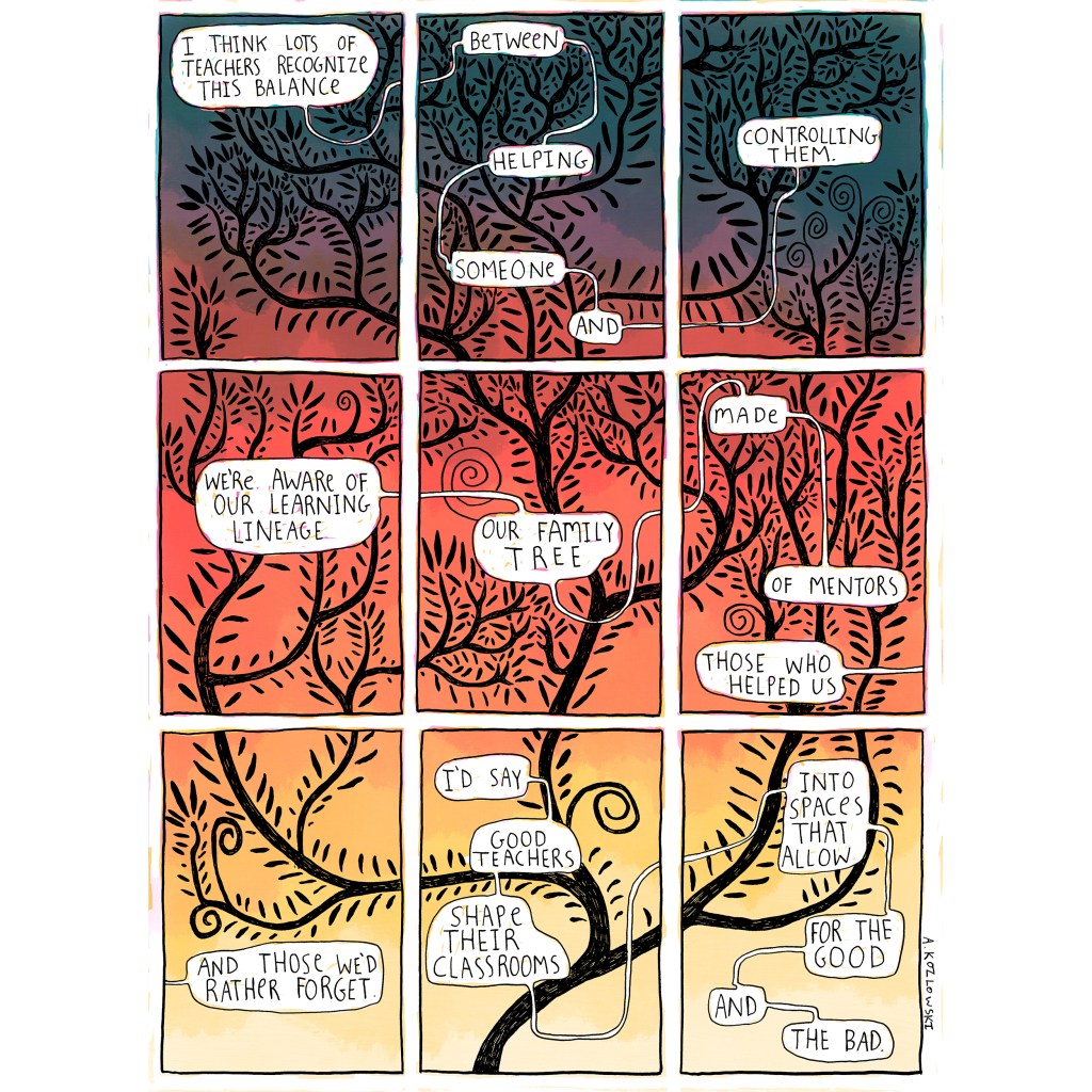 I see a great deal of potential in comics as a device to open up the arts, and specifically to teach creativity and creative thinking through story sharing, but I worry about how all this gets valued as an academic. Beyond the usual ignorant statements about comics not being art, which I think just shows a lack of awareness regarding how far comics has come as a scholarly topic in the past 20-30 years. What I’m thinking of is the challenge of sharing these practices through channels that fit traditional frameworks of teaching and research.