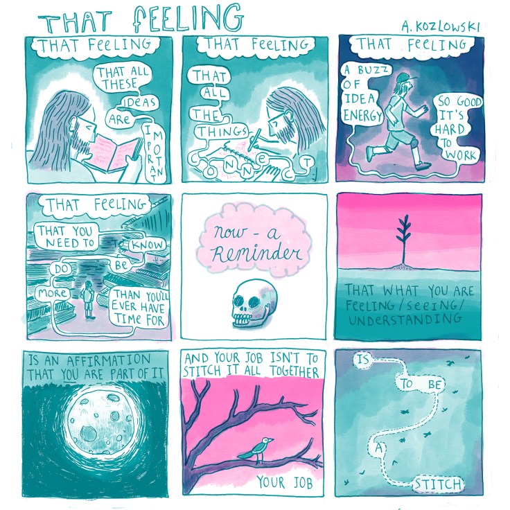 They post regularly on their Instagram page @andrew.kozlowski, they sell comics and zines from their online store at www.papercitypublishing.com, and their older site www.andrewkozlowski.com has images of work in printmaking and installation from the “before times”.