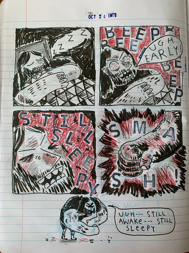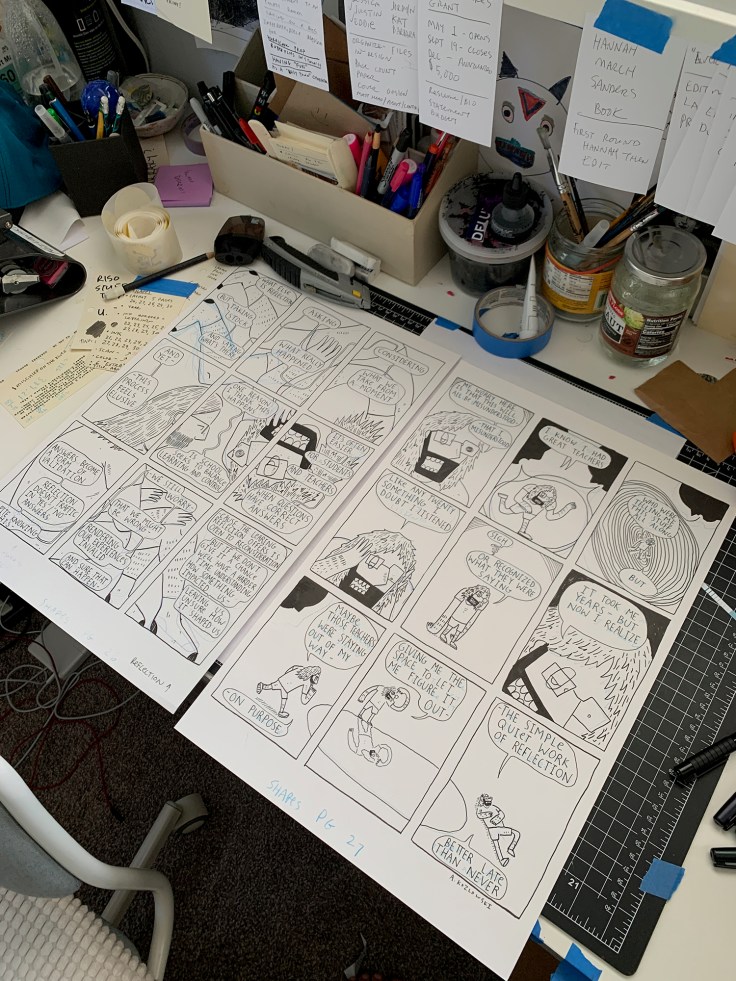 While I do love printmaking, teaching online during the pandemic raised a lot of questions about accessibility. Teaching comics felt like something that worked well in that environment, and it was inexpensive, we could do some heavy lifting with just a pen and some paper. The open landscape of comics just offers so much, it invites a range of voices and stories, and it doesn’t require the same kind of foundations introduction that art curriculum often asks. I purposely developed my Comics and Narrative class without prerequisites, with the hope of drawing students from a range of disciplines.