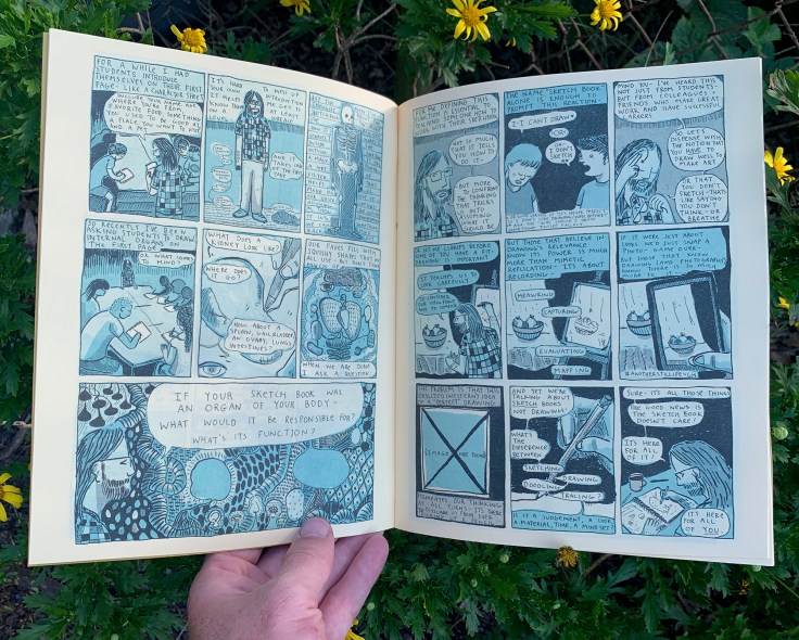 One thing I think about as a teacher is how we often tell students to “go deeper” with their influences, and we often hear and see things like comics as being considered “less valuable” or “less critical” (despite the heaps of growing research into the field). So students end up feeling bad for their taste, for what got them into our classroom in the first place. I reflect back on those first art experiences I had, they weren’t high art. For me, it was comics and being in bands and writing songs. Certainly I’ve grown up since then, but these experiences are vital in my development as an artist. If I didn’t give them the time and reflection I wouldn’t make the work I do now. For me, especially recently, the influence of comics has percolated up through the small press/DIY/zine making ethos, which came from my time in bands as a kid, and has come into sharper focus in where I see the trajectory of my teaching and creative research moving.