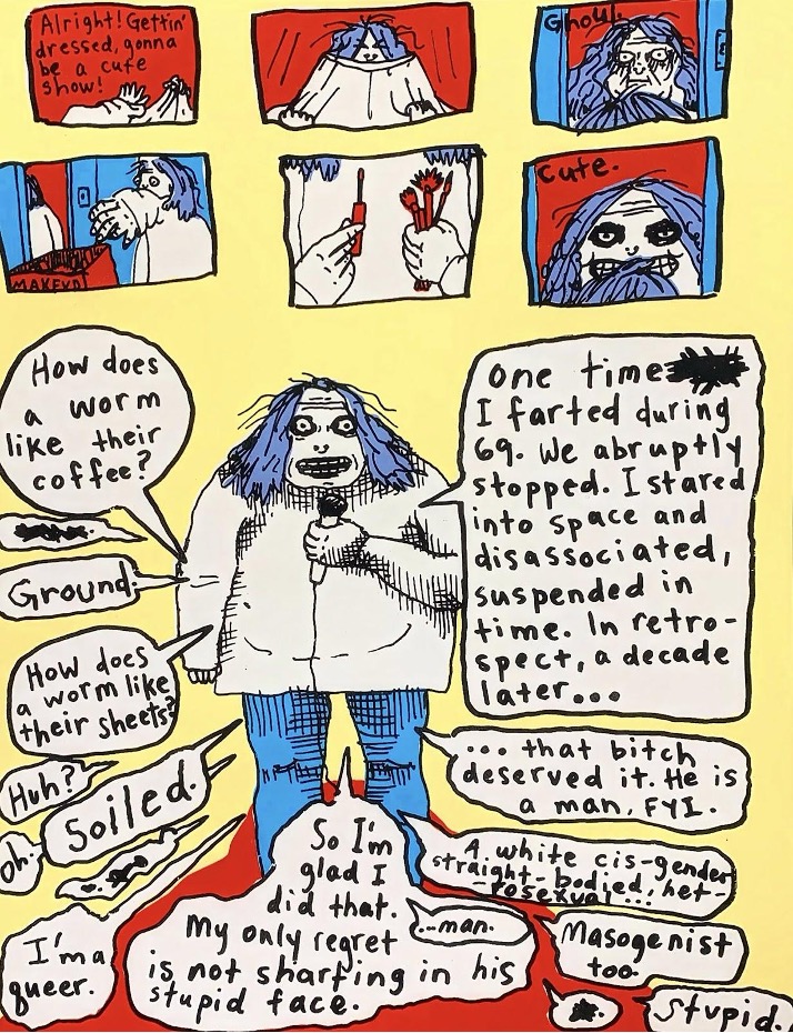 Storytelling. I am obsessed with the way a story is told via sequential drawings. The comics I consume inform me of the visual languages available for telling stories. The ways in which stories are told via comics are special because it’s not just about dialogue or logistics of things moving through space and time, it’s about how a moment FEELS. Comics can strip a feeling down to its core elements and present that experience in a hilariously economical way. A comic can be so simple, yet so incredibly commanding in its ability for profound solidarity and relatability. One simple black and white doodle can stop someone dead in their tracks, epiphanized.