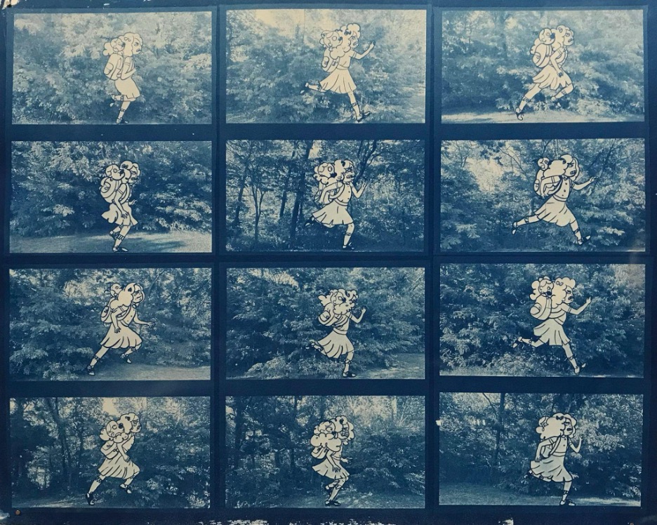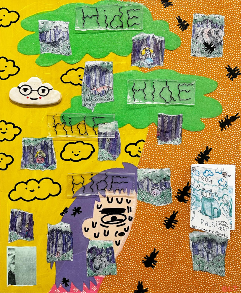 In 2018, I made Seattle’s Hike. It was a sequential story of Seattle hiking through the woods because she is mad at her family. I used acrylic paint on wood panel for the backgrounds. For the foreground and main characters, I made collages made of pressed flowers, sharpie drawings on lined notebook paper cut-outs, imagery from national geographic magazines, and ferns from my bedroom.