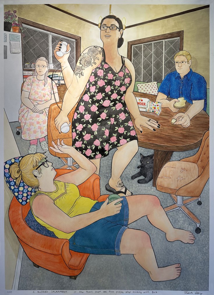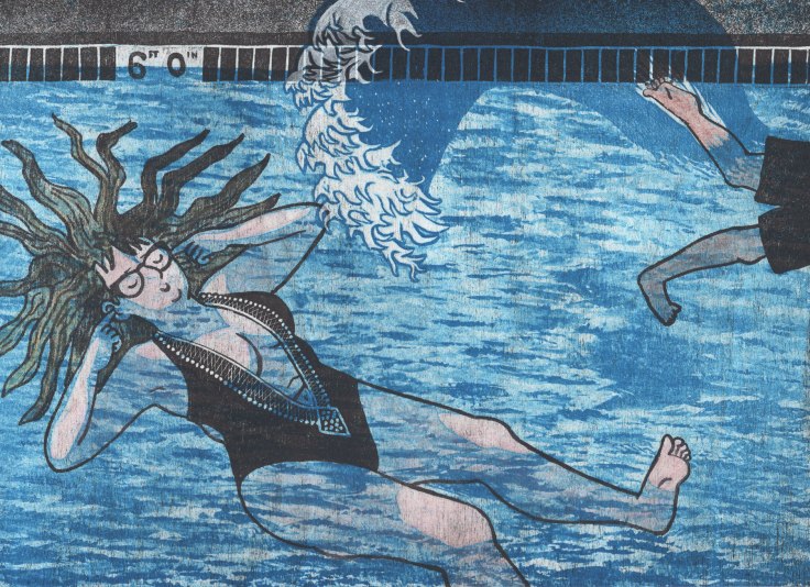 Sometimes Trishelle’s comics are part of a longer narrative, like the book Best Breasts in the West, but often they are singular images that use the methods and visual language of comics. Trishelle primarily uses printmaking to create work and many of her comics are made to be printed matter first and foremost.