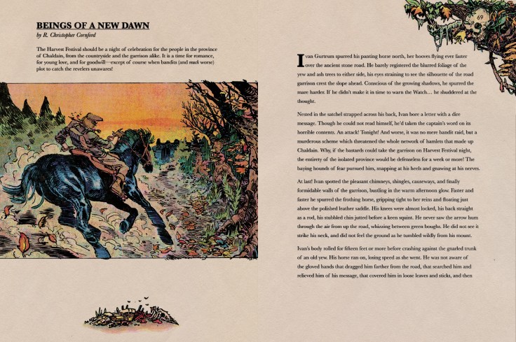 Raphael Cornford, “Raph” in person, and “R. Christopher Cornford” in print, lives and works in Bloomington, Indiana. Raph stays very busy writing and illustrating comics, fantasy and science fiction stories, role playing games, album covers, and other freelance professional gigs. Raph also designs and publishes books (sometimes on the history of comics), and has curated contemporary art shows in the U.S. and Canada.
