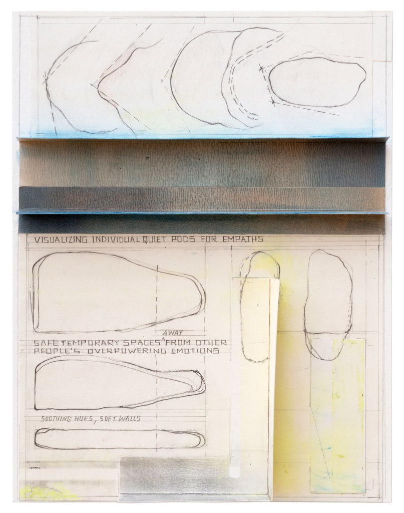 Deb Sokolow makes drawings and books which speculate with humor and criticality on a number of subjects including architecture, politics, organizational structures and the human psyche. Sokolow’s most recent text-driven, maquette-like drawings visualize ideas in which architecture, design, psychology and social engineering overlap.