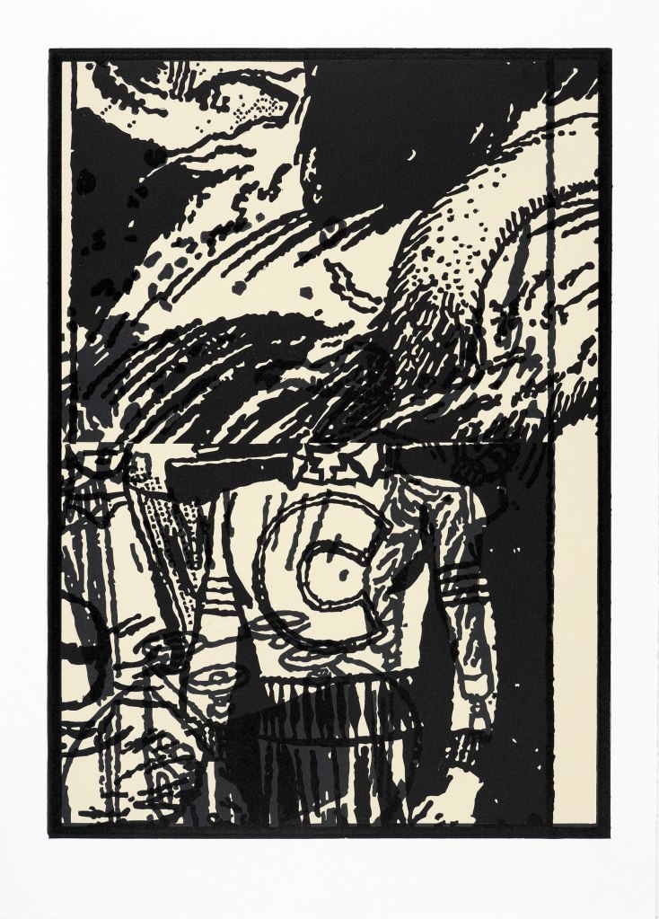 Comic books and strips were originally made for the widest possible distribution and are now entrenched as an essential part of popular culture. I am drawn to woodcut as a medium because a part of its history as a broadly, based “low” art form makes for a logical conceptual connection to comics in the context of my work. I am drawn to comic artists who make dynamic use of fluid brushwork and powerful lights and darks, in the manner of Milton Caniff (Terry and the Pirates), Chester Gould (Dick Tracy), and Hugo Pratt (Corto Maltese). I find this style translates well in terms of mark-making when I re-draw the images and build them up on the block in ink before cutting; I have always felt a close relationship between brushwork and using carving tools.