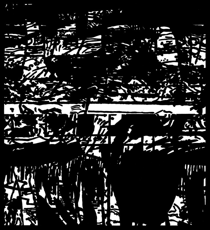 I then started working with comic books themselves, cutting up scanned pages from different genres into horizontal and vertical strips, re-weaving them together, and then cutting them apart to generate new sets of images from the unanticipated juxtapositions. These were then re-scanned, cleaned up, and converted to black and white before being transferred to woodblocks, and back into print media from which they came. The resulting images can be rearranged into sequences or grids that imply new narratives. Working in Photoshop also lets me work with transparent layers, stack images on top of one another, and then overlap them in the prints to further mask their specific identities.