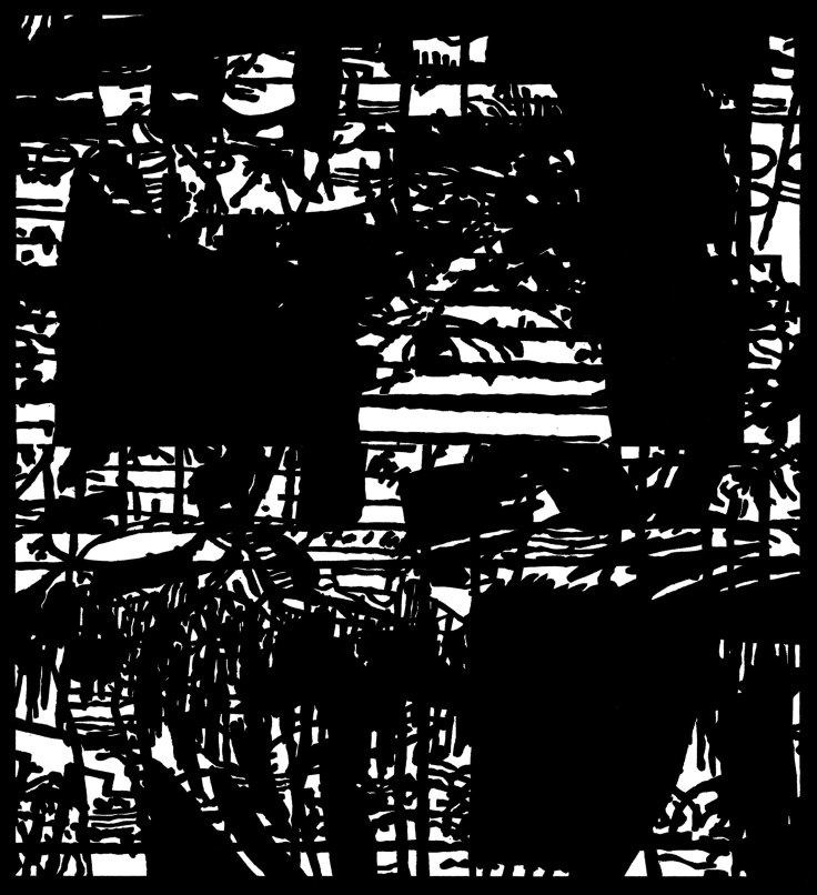 I found that the clippings I was getting were decontextualized to the point that their sources were no longer identifiable (e.g., no super-heroes) recalling Ray Yoshida’s comic collages of the late 1960s. These also suggested Jess Collins’ Tricky Cad, a surrealistic reconstruction of Chester Gould’s Dick Tracy that echoes the collages of Max Ernst. Gradually, since I had now had these comic bits in my cut-up box, they started working their way into images I was developing for woodcuts.