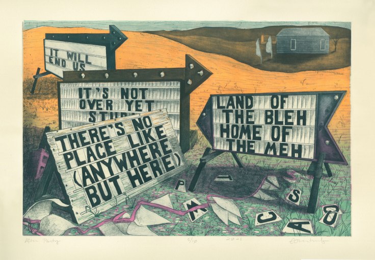 When making singular images with many points of text, such as “After Party” where there are many hand-made signs in one yard, I am considering the form of the signs, the background, and the content in the signs. I am considering the relationship of text to text and their placement within the hierarchy of the composition. With only an image, there are ways to lead the viewer to your intentions, but words tend to have more concrete meaning. When they are blended, I can skew the meaning.