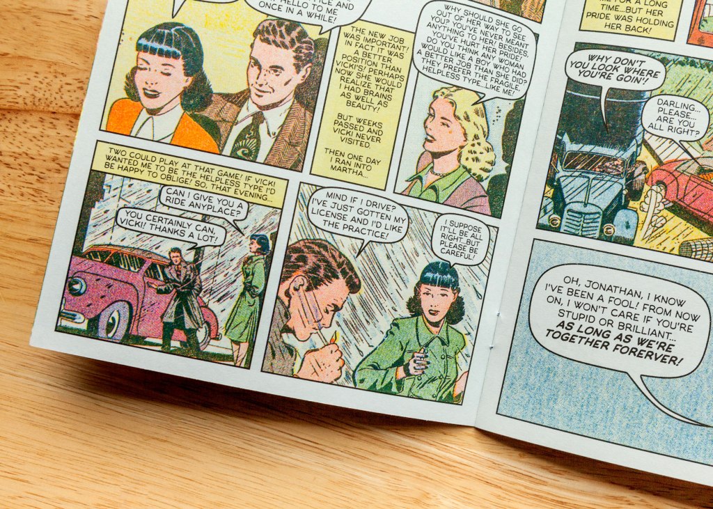 For example, Ghostland is an intervention project where I removed all characters and dialogue from old Casper the Friendly Ghost comics, creating a loosely narrative story composed entirely of backgrounds and empty environments. In Boys in Love, I swapped the male and female dialogue in vintage romance comics to explore shifting, or stagnant, gender dynamics in popular media across decades. In both cases, I’m explicitly engaging with the historical and cultural context of the original material.