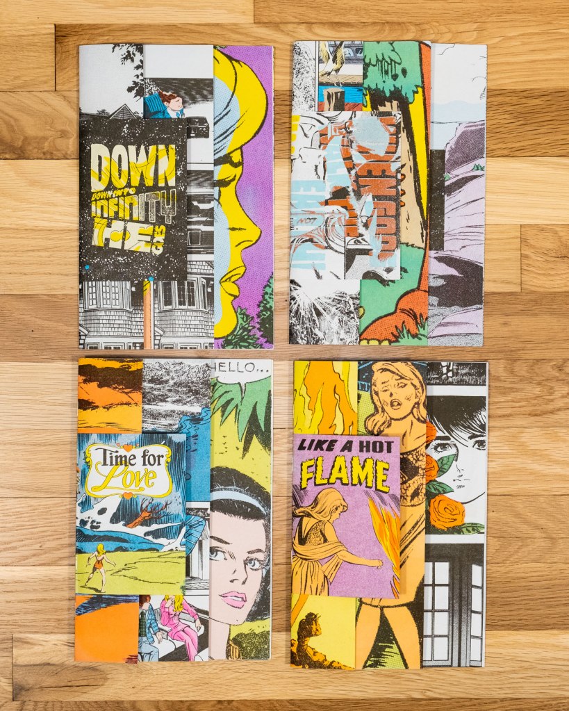 On the more collage-based side, I recently completed a series based on T.S. Eliot’s The Four Quartets. Each of the four books responds to one of the four poems, combining his text with imagery and language sourced from a wide range of comics. Threads and themes of romance, isolation, time, and memory cut across the source material and are woven together into something new. Of course, even in the more collage-based pieces, the final result is still referencing the historical context and visual culture of the source material by virtue of its aesthetics and recognizable structures and tropes, but in a less direct way than the interventions.