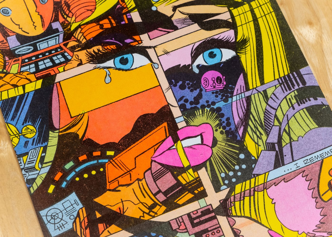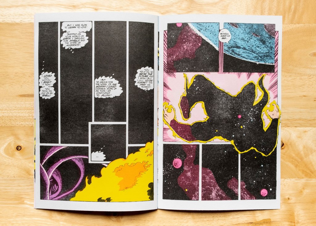The printing method I use for my prints and zines is also inspired by comics history. I use a faux-CMYK process on the Risograph where I will print color flats using the Riso’s yellow, fluorescent pink, and aqua inks and top that with my black line work. This method echoes the traditional CMYK offset printing used throughout comics history that combined color flats with black-inked line work. You can see an example of that here.