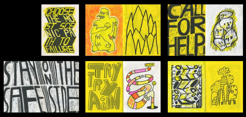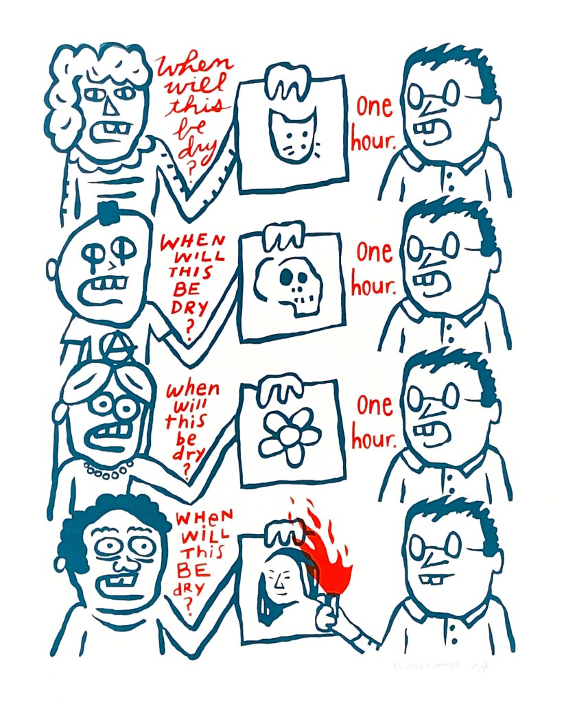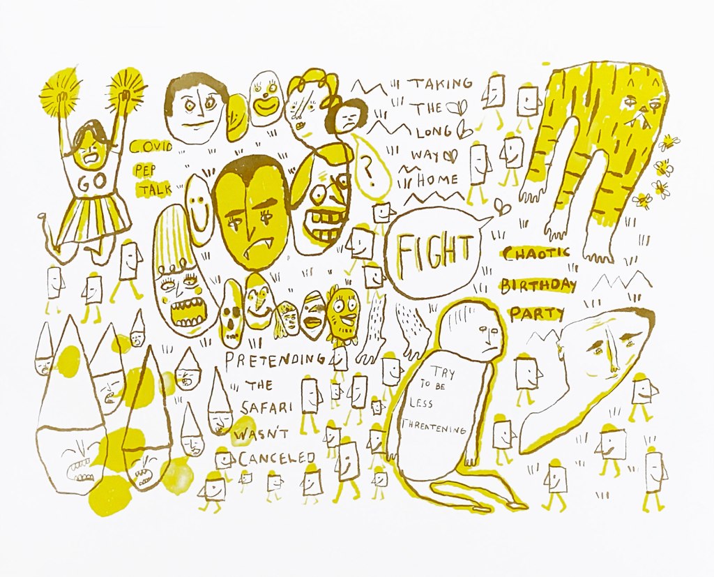 As a printmaker, I’m particularly drawn to the graphic quality of comics; the bold line work, expressive characters, and sequential narratives. These elements have informed my experiments with animation and zines, where I combine traditional printmaking techniques with visual humor and storytelling.