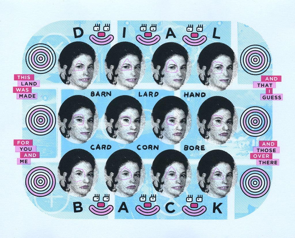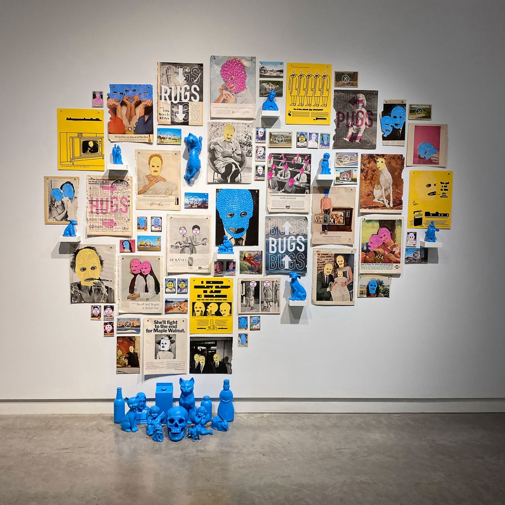 Screen print on magazine pages, baseball cards, and postcards, acrylic paint on found objects