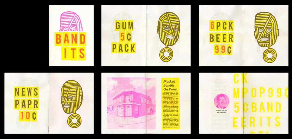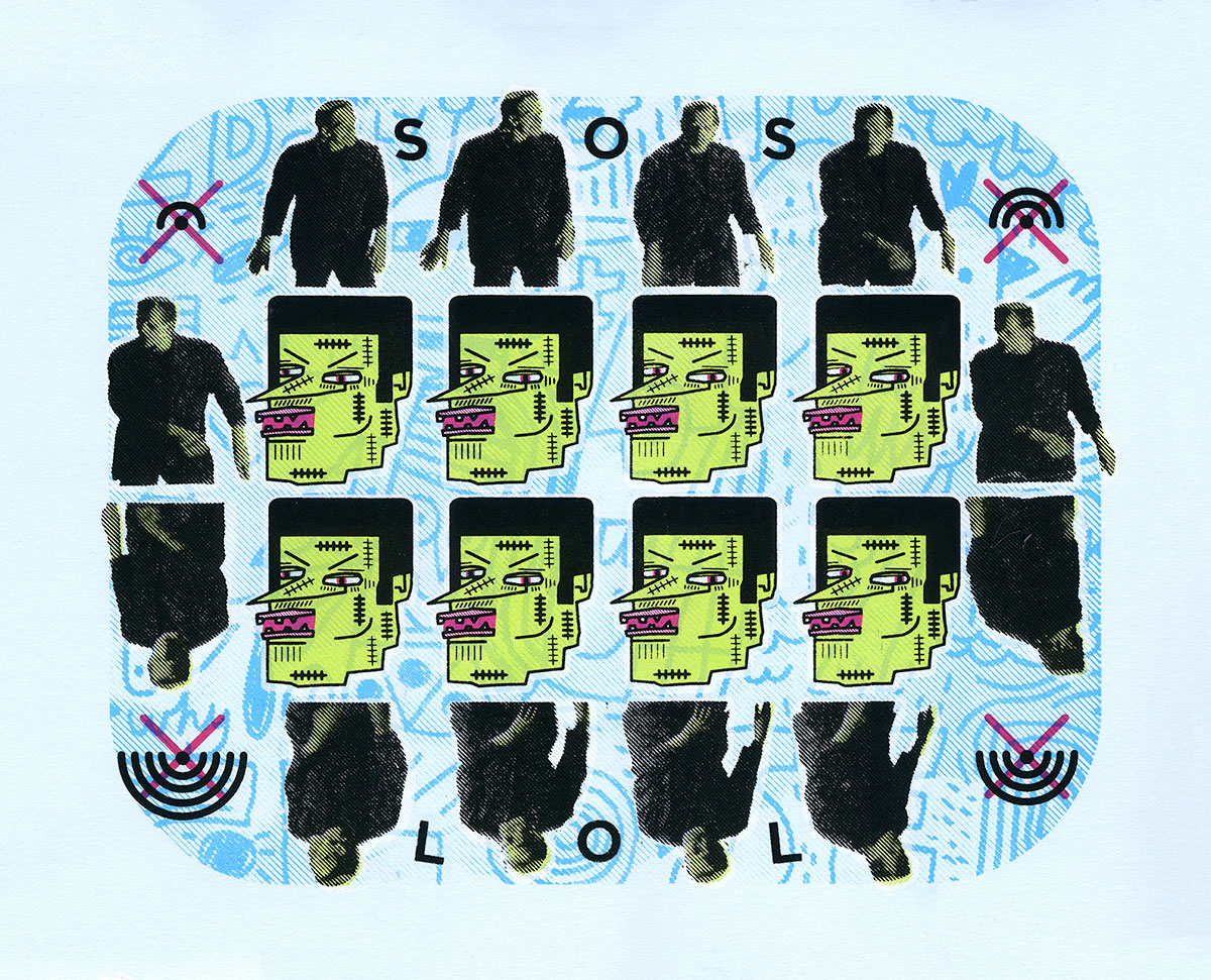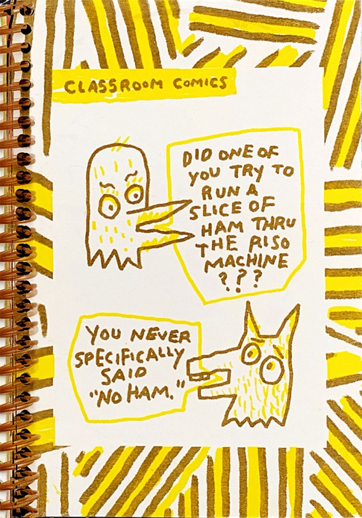 Through printmaking, collage, zines, and installation, David blends topical humor, social commentary, and parody. Social media, digital communication, and technology are a constant source of inspiration. David teaches a zine class where many students explore their interest in comics and publish works on Risograph machines.